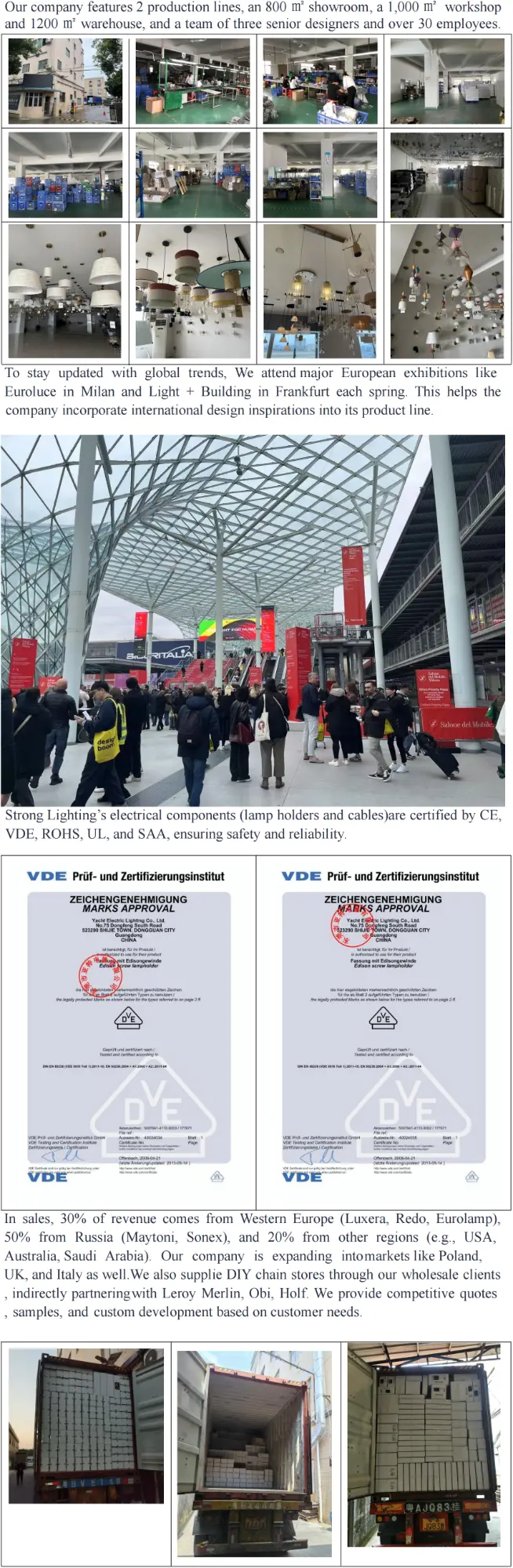 Strong Lighting, med rötterna i Zhongshans Guzhen stadsbelysningsnav, hämtar inspiration från globala trender på Milan Euroluce och Frankfurt Light + Building-utställningar, vilket säkerställer att vår design ligger före branschens kurvor. Vår 1 000㎡ verkstad och dubbla produktionslinjer stödjer en årlig produktion på 100 x 40HQ containrar, vilket gör att vi kan hantera storskaliga bulkorder med jämn kvalitet.