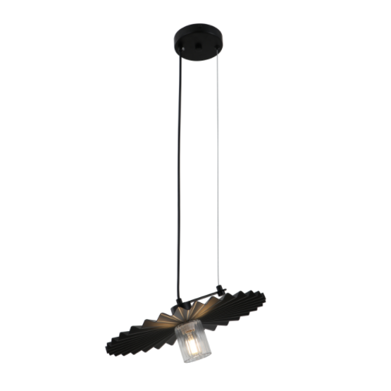 Denna minimalistiska svarta hängslampa med veckad skugga ger subtil sofistikering till dina interiörer. Den vikta metallskuggan skapar mjuka geometriska skuggor, medan det klara glaslampans hölje säkerställer ljus, jämn belysning. Perfekt för små utrymmen som behöver stil utan röran.