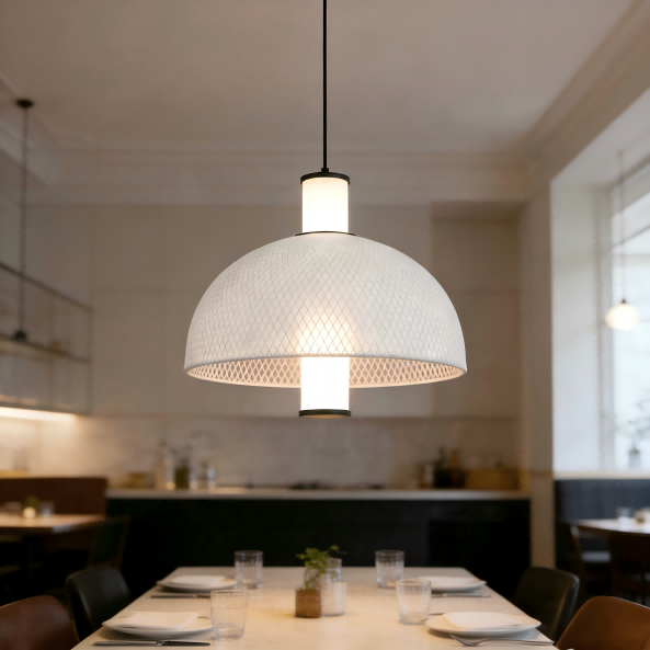 Inspirerad av de banbrytande designtrenderna på Euroluce-utställningen i Milano 2025, denna minimalistiska pendellampa i italienskt sidennät från Strong Lighting blandar sömlöst italiensk minimalism med praktisk funktionalitet. Den centrala 15W LED-ljuskällan avger ett 4000K neutralt ljus, vilket skapar en bekväm atmosfär. Med en ljusstyrka på 1500LM och ett högt färgåtergivningsindex på Ra>80 är ljuset naturligt och verklighetstroget, vilket gör det lämpligt för vardagsrum, matsalar och andra utrymmen. Den runda bågformade lampskärmen är gjord av järnnät lindat runt vitt sidentyg, och den mattsvarta hårdvaran är avslutad med en sprayfärgsprocess för att lägga till textur. Den enkla designen integreras lätt i nordiska, moderna och andra hemstilar.