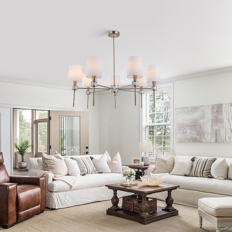 Storleken på denna Strong Lighting-leverantör Multi-Lights Off-White Cylindrical Fabric Shade Mässing hängande ljuskrona är väldesignad. Den är varken för stor för att utrymmet ska kännas trångt eller för litet för att sakna närvaro. Den kan anpassas väl till utrymmen av olika storlekar, oavsett om det är ett rymligt vardagsrum eller en relativt kompakt matsal på bondgården, och kan smälta in perfekt och visa upp sin unika charm. Vi har fått många återkommande grossistbeställningar för denna Multi-Lights off-white cylindriska tygskärm i mässing hängande ljuskrona.
