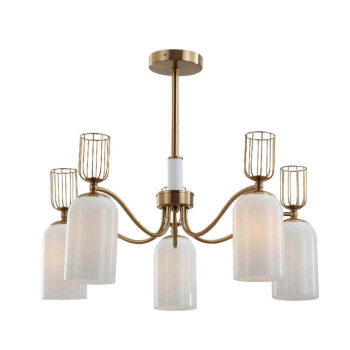 OEM/ODM-tjänster: Stark belysning Retro 5-ljus mjölkvitt glas guldkronor kan modifieras ytbehandlingar (antik mässing/svart), skuggformer eller kedjelängder.